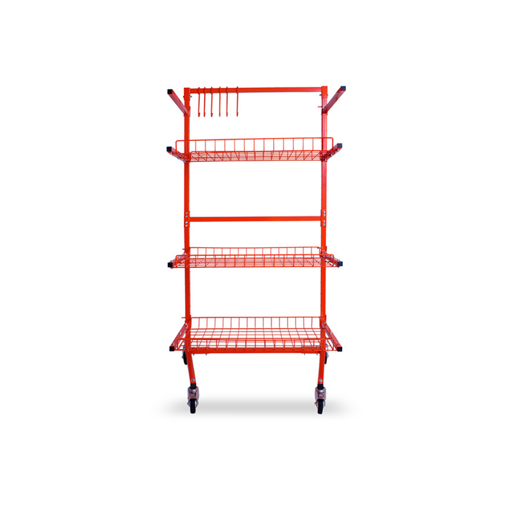 Designed for versatility, the trolley includes two support arms and six hooks for hanging or displaying additional items, making it ideal for busy workshop environments where efficiency and organisation are essential.